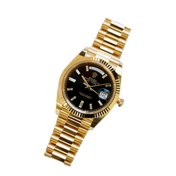 2025 ROLEX DAY-DATE 40MM BLACK BAGUETTE FULL YELLOW GOLD 228238